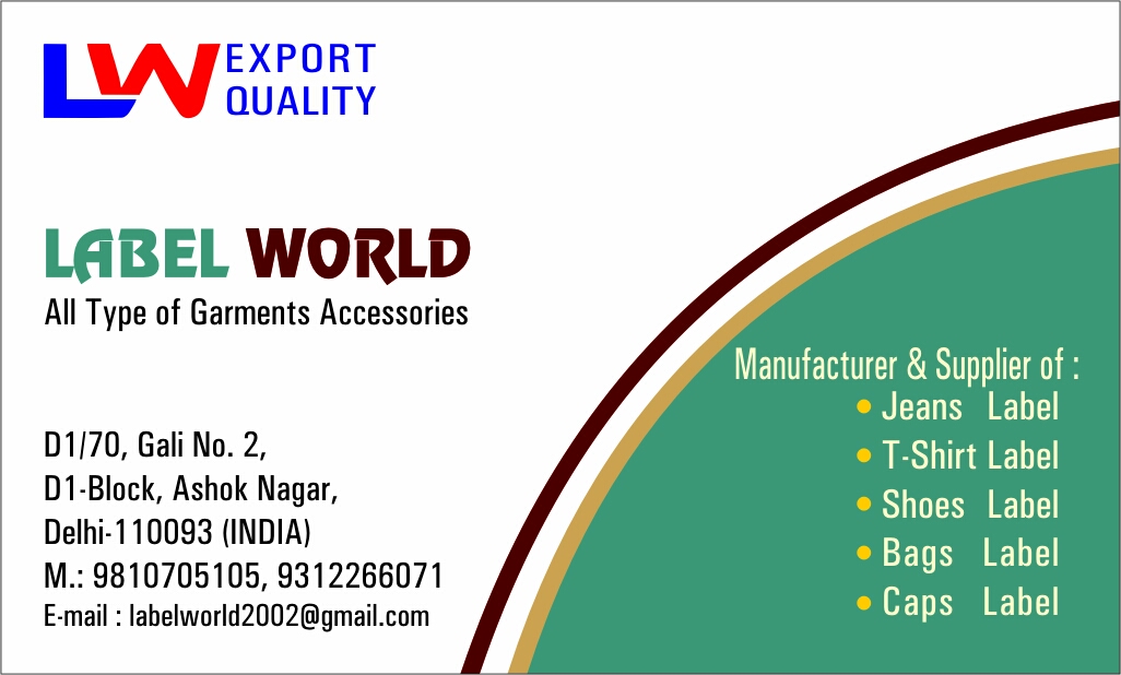 Clothing Label Manufacturers In Delhi India, Clothing Label Manufacturer Shero Creations is best Clothing Label Manufacturers in Delhi. As a reputed Clothing Label manufacturer in India, we offer Clothing Label in various design, sizes and colors +91-9551800700 All classifieds - Veux-Veux-Pas, free classified ads Website All classifieds - Veux-Veux-Pas, free classified ads Website. Come and visit our site, already thousands of classified ads await you ... What are you waiting for? It's easy to use, no lengthy sign-ups, and 100% free! If you have many products or ads, Jeans Label Manufacturers in Delhi - जीन्स लेबल मनुफक्चरर्स, दिल्ली Jeans Label Manufacturers in Delhi - जीन्स लेबल मनुफक्चरर्स, दिल्ली SORT RESULTS BY Top Results Popularity Location Distance Open Now Ratings Best Deal Gayatri Label Company 3.6 34 Votes Street No 15, Kalk.. | more.. Label Manufacturers, Woven Label Manufacturers, .. Opens at 9:00 am tomorrow Laxmi Label 4.7 10 Votes